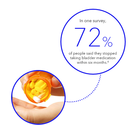 You have to remember to take these medications every day. Some side effects can be unpleasant, such as dry mouth, blurry vision, constipation, and hypertension.2 Other side effects are more serious. In fact, data suggests that one class of drugs for OAB (anticholinergics) may increase risk of dementia in elderly people.3 Even more important, these medications don’t always work. In one survey, 72% of people said they stopped taking their medication after just six months.4